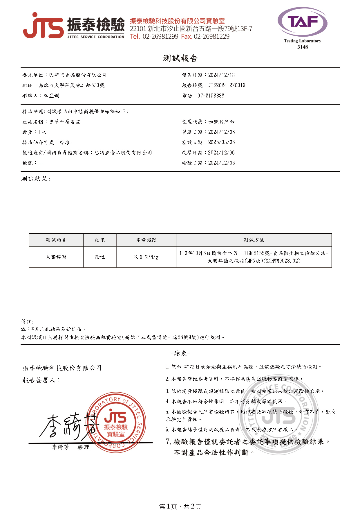 製造廠商或國內負責廠商名稱:巴特里食品股份有限公司