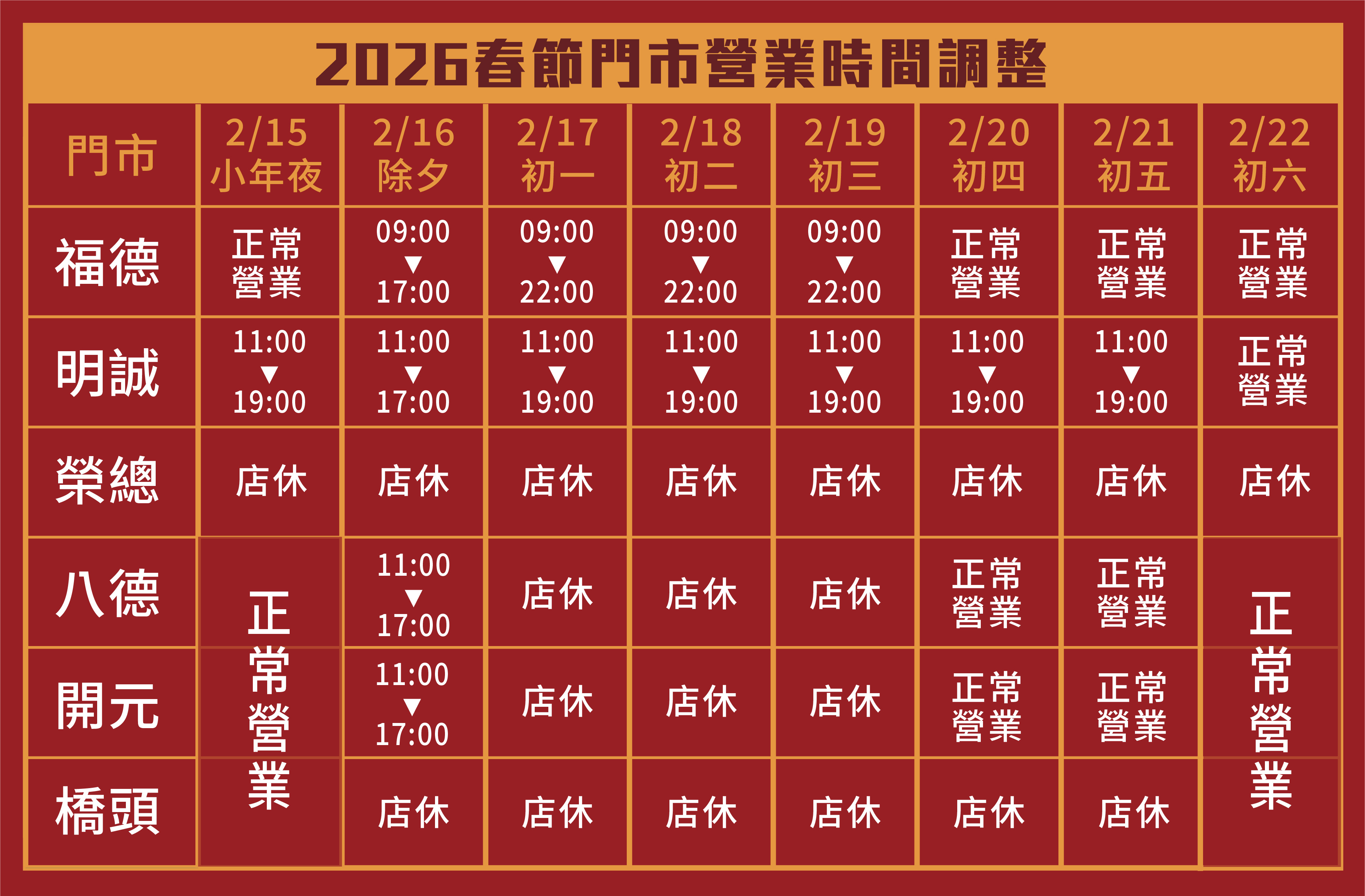 2026 春節假期 門市營業時間